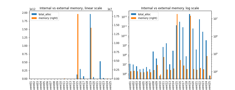 Another perspective on memory use is the number of memory allocations made. Many of these are short-lived and reclaimed by the garbage collector. As you can see, in most cases the memory churn follows the memory use.