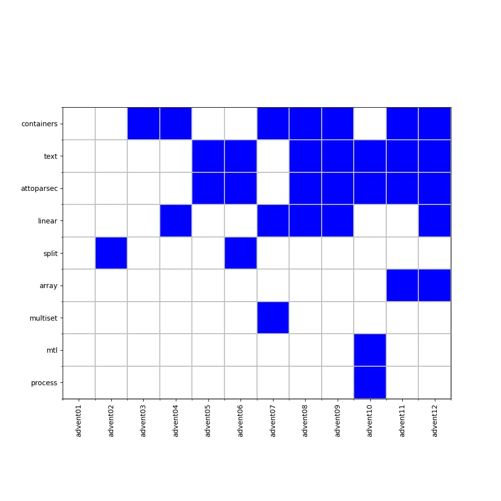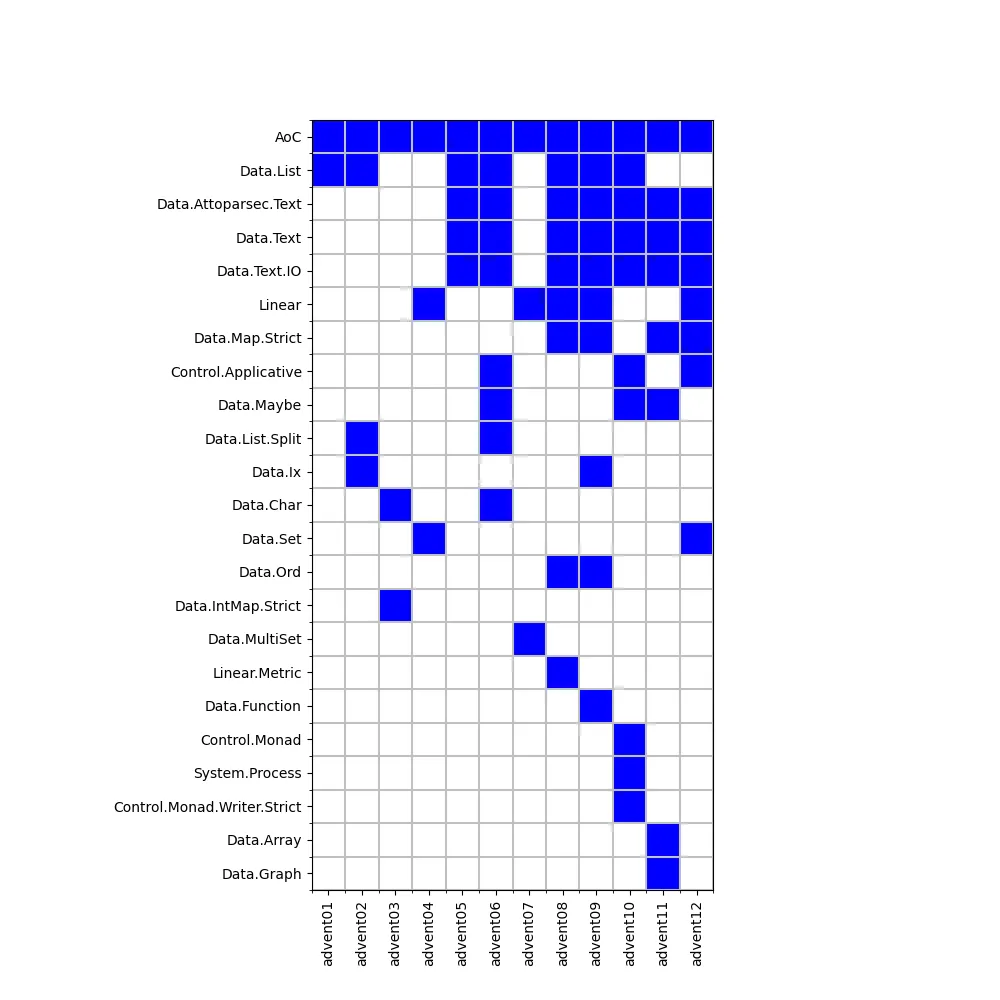 Looking at the modules used gives a bit more detail. The AoC module is my own that consists of little more than a convenience function for loading data files. This shows that Data.List does a lot of work in many problems. I use Linear for coordinates. Other modules turn up for general utility.